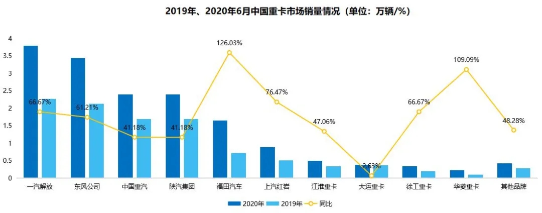 2020年上半年,重卡市場(chǎng)呈現“V”型走勢:分企業(yè)來(lái)看,上半年重卡銷(xiāo)量排名第一的為一汽解放,累計銷(xiāo)量達到22.86萬(wàn)輛,同比增長(cháng)32%,市場(chǎng)占比為28.2%;東風(fēng)汽車(chē),累計銷(xiāo)量達到15.11萬(wàn)輛,同比增長(cháng)19%,市場(chǎng)占有率為18.7%;中國重汽,累計銷(xiāo)量為11.74萬(wàn)輛,同比增長(cháng)14%,市場(chǎng)占有率為14.5%;陜汽集團,累計銷(xiāo)量為10.81萬(wàn)輛,同比增長(cháng)9%,市場(chǎng)占有率為13.4%;福田汽車(chē),累計銷(xiāo)量為7.72萬(wàn)輛,同比增長(cháng)68%,市場(chǎng)占有率為9.5%。